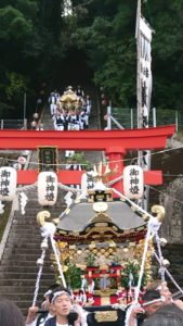 このお宮の階段、なんと190段くらいあります!降りるだけで一苦労です。御神輿は宮出しされた瞬間から祭が終わるまで一度も地面に御神輿本体の足をつけません!(`´)(休憩中は専用の足置きに置きます)
